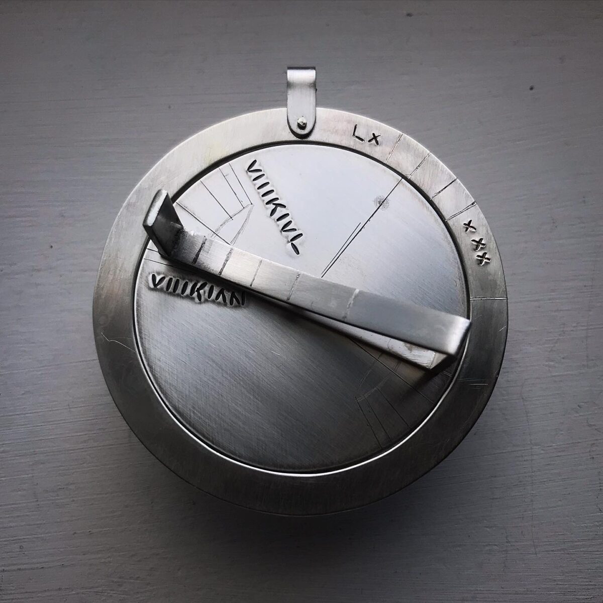 This portable sundial is inspired by a Roman dial in the collection of the Museum of the History of Science in Oxford (51358). It can be set to any latitude (i.e. the numbers on the outer ring) and any date (i.e. the months on the inner disc). From the shadow of the gnomon you can