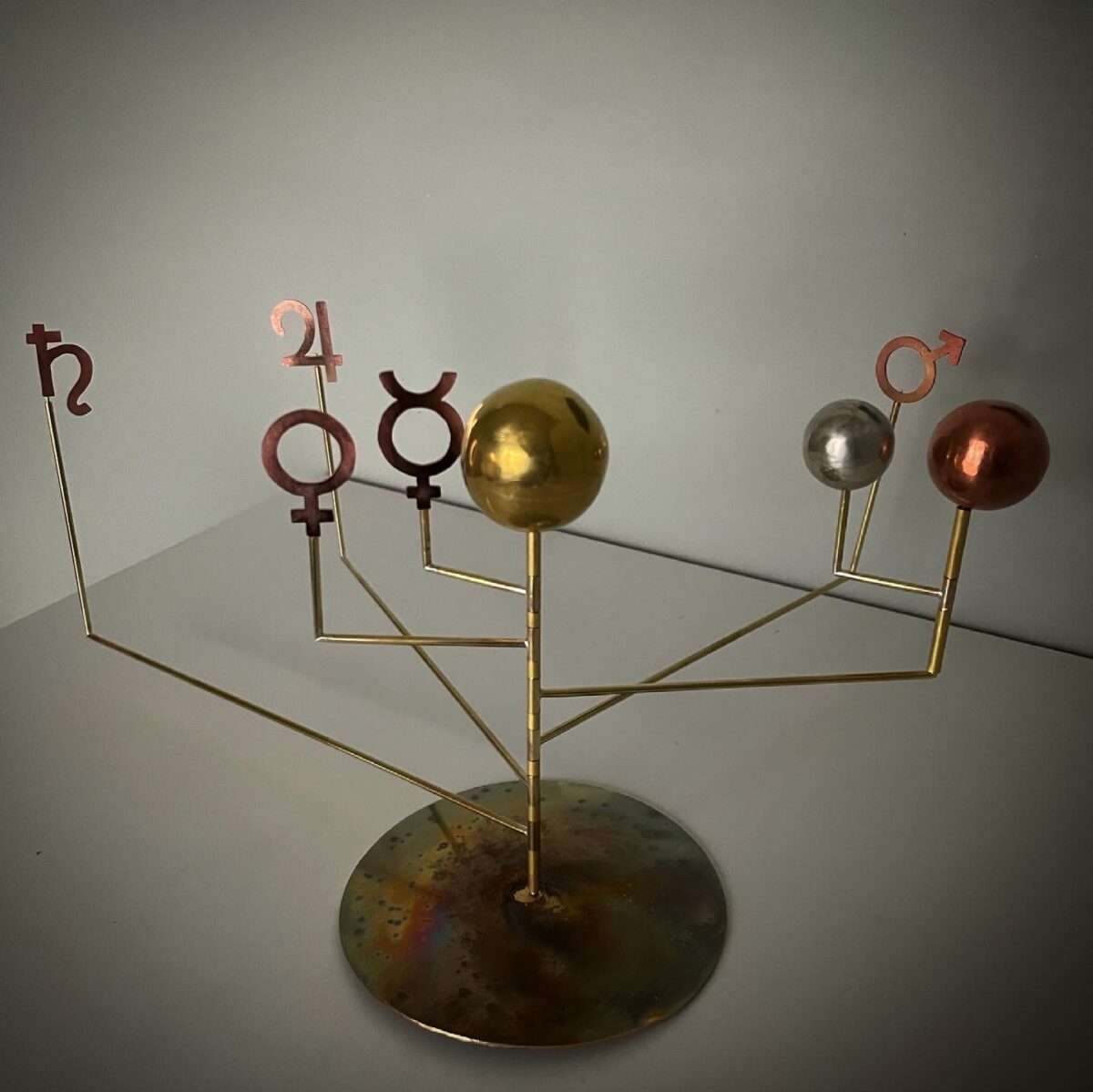 Heliocentric planetarium with Earth and the (symbols of the) seven sky objects that are visible with the naked eye. These seven objects move differently than all the (other) celestial objects we see. In ancient Greece they were therefor called ‘planetes’ (‘wanderers’). They are the sun, the moon, and the planets Mercury, Venus, Mars, Jupiter and