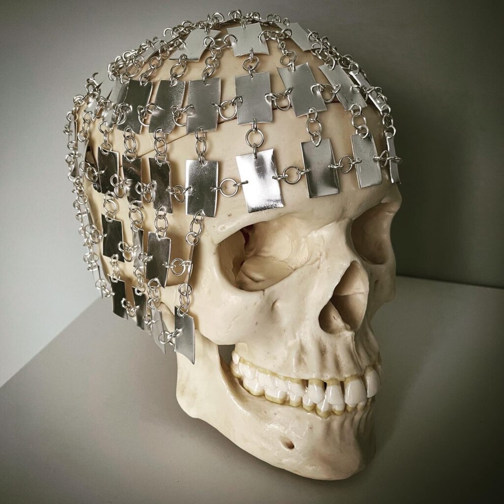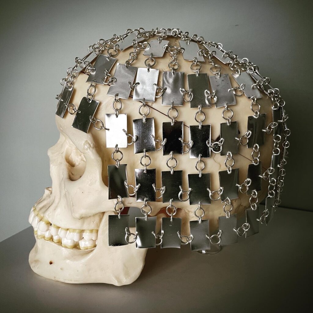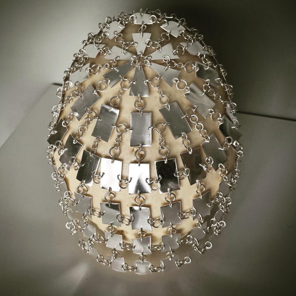 Inspired by both armour and jewellery, by many different cultures in many different times. The plates have the lustrous colour of pure silver. They are very soft and their warping forms bring liveliness in the repetitive pattern.